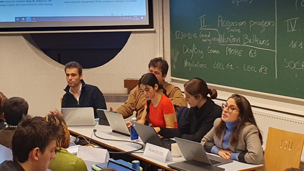 The excursion opened with presentations by Dr. Claudia Matthes and Prof. Ivana Radić Milošavljević from the University of Belgrade, offering a comprehensive overview of the EU’s enlargement procedures, along with the political, economic, and legal benchmarks that guide accession. Students also presented their research and began group negotiations as part of the simulation. The program continued with an insightful presentation by Benjamin Bodson, followed by group simulations where students worked toward reaching an agreement and drafting a conclusion on the enlargement strategy.