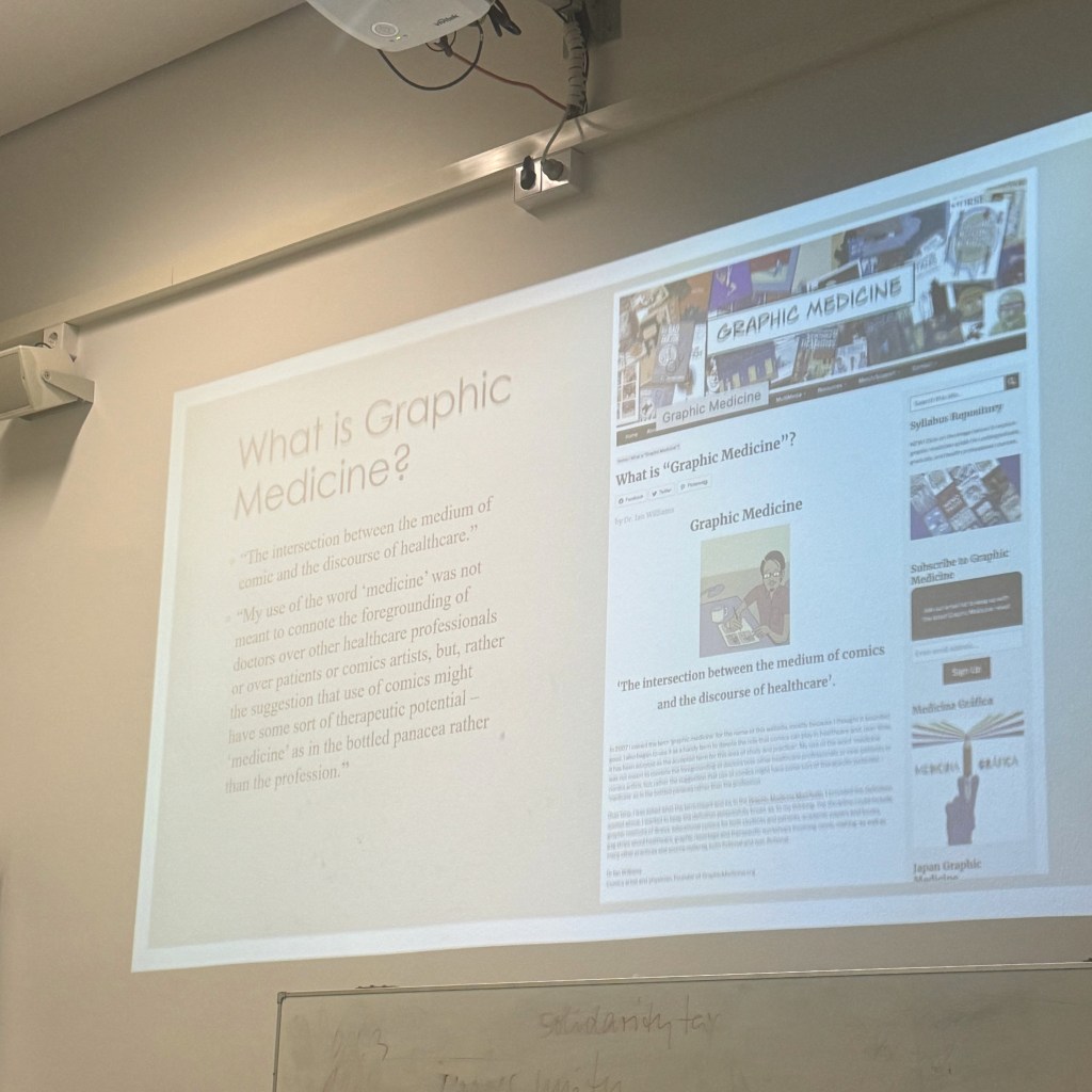 As Prof. Layne explained, graphic medicine—a subgenre of comics—combines comic studies, medical humanities, and trauma and disability studies. It emphasizes illness, trauma, and disability, often through graphic memoirs that capture these experiences from an insider’s perspective. By using both imagery and text to portray illness and trauma, creating narratives that transcend traditional language’s limitations. This genre questions stable identity constructs, promoting a more inclusive and less ableist understanding of human experience.