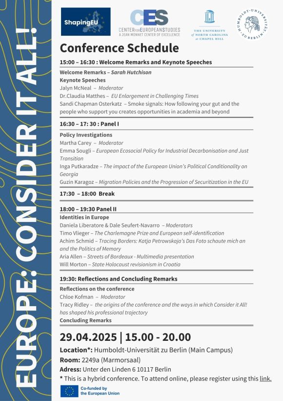 The Jean Monnet Chair ShapingEU, in partnership with UNC Chapel Hill, proudly hosted the 2025 edition of EU Enlargement in Challenging Times/ Consider it all, a unique transatlantic conference. The event took place in person at both UNC Chapel Hill and Humboldt University of Berlin, with a Zoom option for global participation.