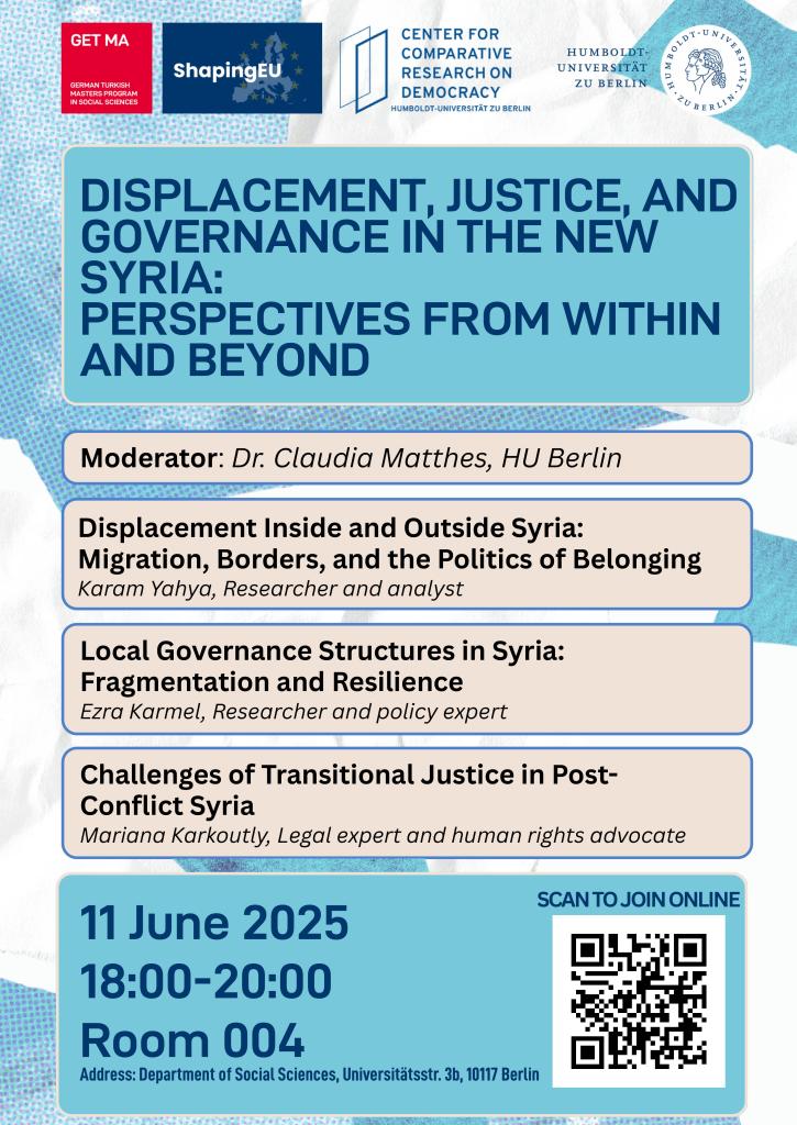 As part of the Shaping EU series and in collaboration with the Center for Comparative Research on Democracy (CCRD) at HU Berlin, we hosted the event “Displacement, Justice, and Governance in the New Syria: Perspectives from Within and Beyond.”